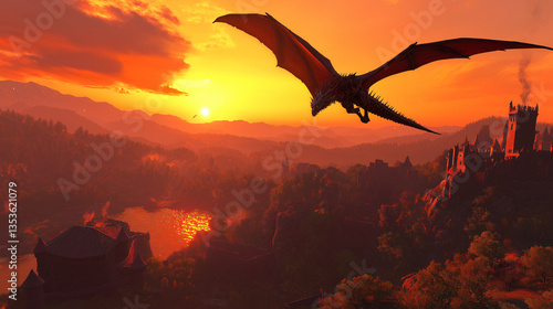 Dragon Flying Over Castle at Sunset