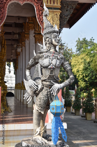 Dragon-Human Hybrid Statue with Blue Lantern, Wat Chang Kham, Chiang Mai