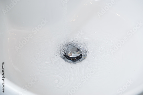 Drain chrome valve in white washbasin