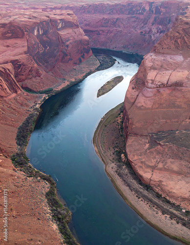 Dramatic aerial view of a winding river cutting through red rock canyons. Captures natures power and beauty. Great for travel, adventure, and conservation themes.