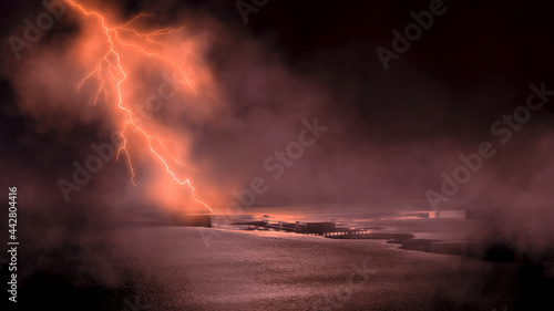 Dramatic background of the night sky, thunderstorm, lightning. Smoke, fog, smog against the background of the city landscape. Natural night landscape, night sky, wet asphalt, puddles.