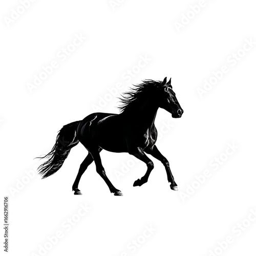 Dramatic black Friesian horse gallops powerfully, its dark silhouette and flowing mane creating a sense of mystery and wild elegance perfect for equestrian themes