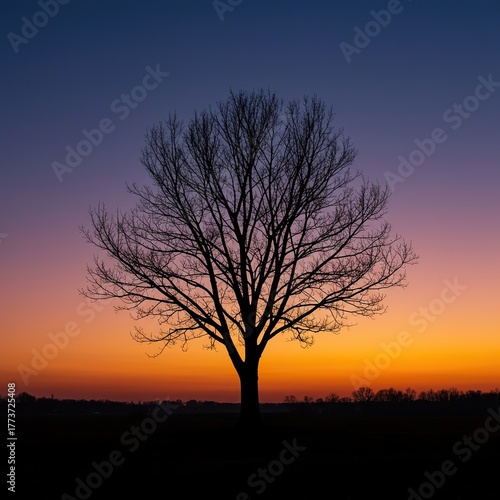 Dramatic black outline of a solitary bare tree reaching towards a vibrant, colorful sky at dawn, creating a striking visual contrast ,scenic ,serene ,evening