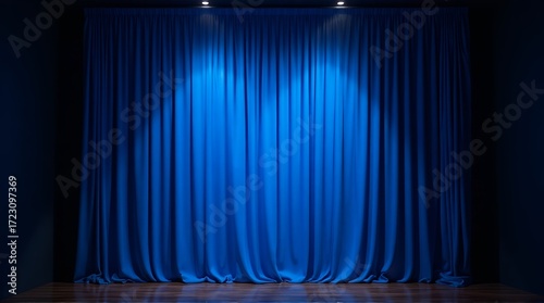 Dramatic blue stage curtains illuminated by spotlight create an inviting theatrical atmosphere for presentations, performances, or reveals.