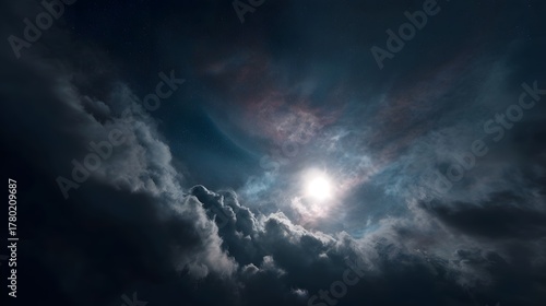 Dramatic celestial scene with a bright sun stormy clouds starry sky and cosmic ring