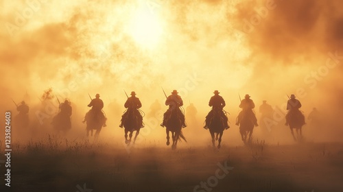 Dramatic Charge of Cavalry at the Crest Against a Fiery Sunset