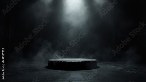 Dramatic circular stage illuminated by spotlights in a dark and moody atmosphere with smoke and particles
