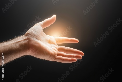 Dramatic close-up of a hand reaching into pitch-black space, light and shadows capturing tension, mystery, and human connection