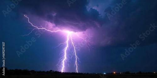 Dramatic close-up of a powerful lightning bolt striking during a fierce thunderstorm, illuminating the dark night sky with intense light and energy , power, storm clouds
