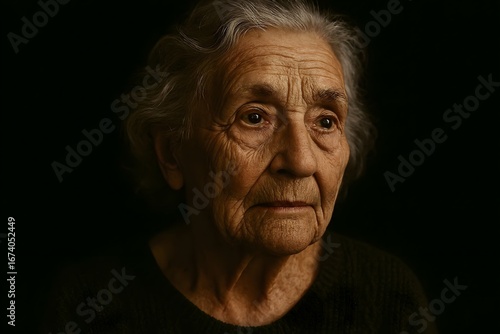 Dramatic Close-Up Portrait of Elderly Woman with Wrinkled Skin and Silver Hair Against Black Background – Emotional Expression, Soft Lighting, Timeless Aging Beauty Concept.