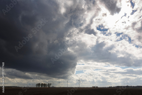 Dramatic cloud formations loom over wind turbines in a rural landscape during an overcast day
