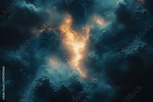 Dramatic clouds illuminated by a fiery glow, creating a mystical atmosphere in a stormy sky