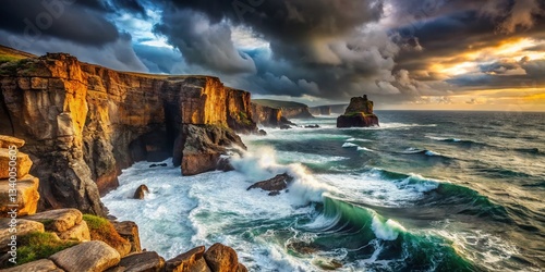 Dramatic Coastal Cliffs, Stormy Sea, Turbulent Waves - Stock Photo