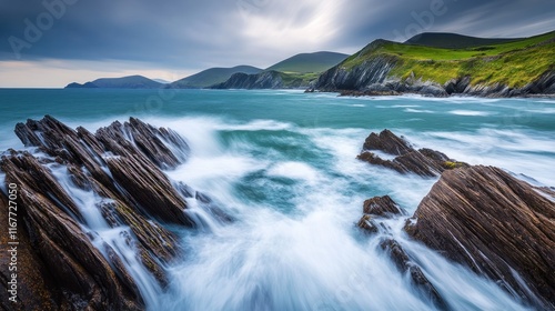 Dramatic coastal scene with crashing waves on rocky shore, green hills under cloudy sky.