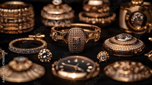 Dramatic composition of various gold luxury items like cufflinks and rings, set against a deep black backdrop to enhance their allure