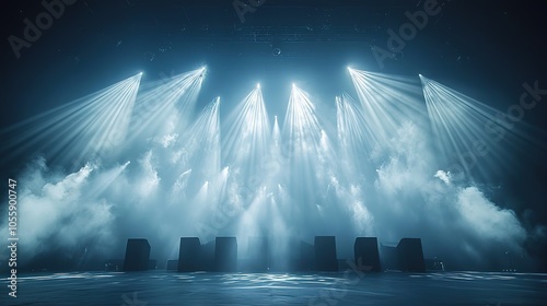 Dramatic concert stage with spotlights and laser lighting show and atmospheric smoke