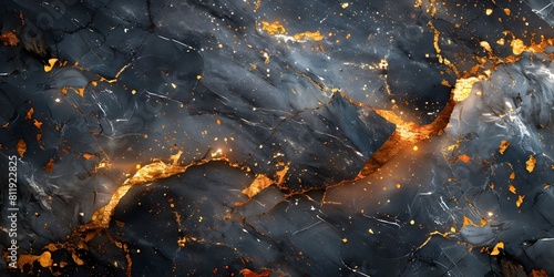 Dramatic Cracked Black Marble Abstract Background with Fiery Accents and Textural Details