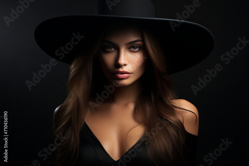Dramatic dark studio portrait of elegant and sexy young woman in black wide hat and black dress.