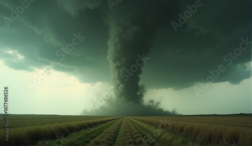 Dramatic depiction of a powerful tornado ripping across a field under a stormy, yet partially sunny sky. Intense weather scene., ultra detailed, 8k resolution, HDR, professional