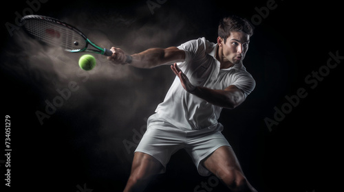 Dramatic energetic shot of a handsome young male tennis player dressed in white playing tennis with tense muscles on a black background.