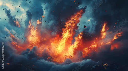 Dramatic explosion with a burst of fire and smoke. Cinder. Illustration