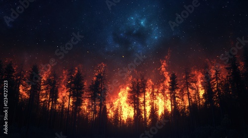 Dramatic forest fire under starry sky wilderness high-fidelity image nighttime nature's fury