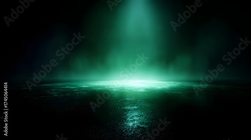 Dramatic green spotlight beam illuminates a wet textured floor amidst swirling mist and atmospheric haze