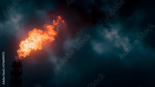 Dramatic industrial flare stack ignites with vibrant orange flames against a dark ominous sky emitting thick smoke plumes