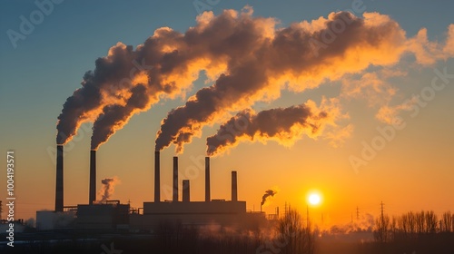 Dramatic Industrial Landscape with Billowing Smoke Stacks against Fiery Sunset Sky