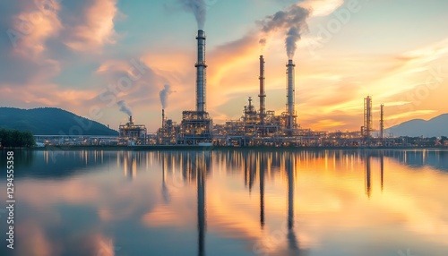 Dramatic industry landscape with smokestacks reflecting in calm waters at sunset, showcasing the beauty and challenges of modern industry.