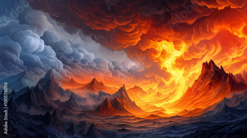 dramatic landscape featuring fiery orange and red hues against dark mountains, showcasing volcanic eruption under stormy sky. scene evokes sense of awe and power.