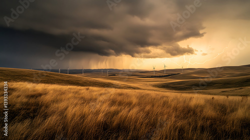 Dramatic landscape featuring wind turbines and a powerful storm with lightning. Rolling hills and golden fields contrast with the dark, ominous sky. A scenic blend of energy and nature.