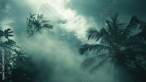 Dramatic landscape with palm trees and dark stormy clouds in a tropical setting
