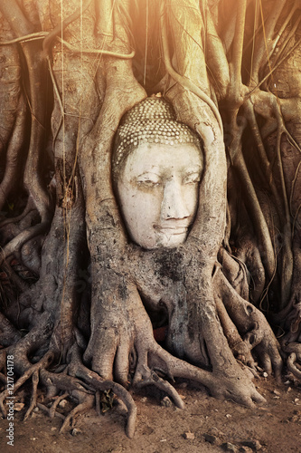 Dramatic Light of Ancient and historical Buddha head in the tree state at Ayutthaya Thailand