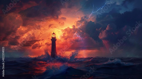 dramatic lighthouse silhouette against stormy sea and lightning bolt at sunset natural calamity concept digital painting