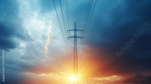 Dramatic Lightning Strike Behind Electricity Transmission Tower at Sunset