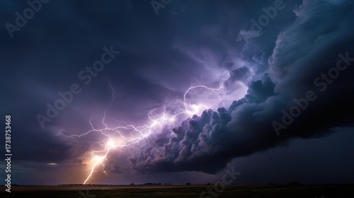 Dramatic Lightning Strike Illuminates Storm Clouds Over Darkened Landscape, Atmospheric Scene.