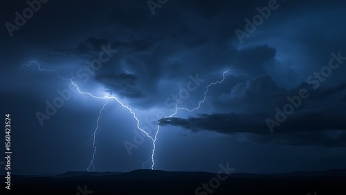 Dramatic lightning strike over a dark stormy landscape with electric blue flashes illuminating clouds.