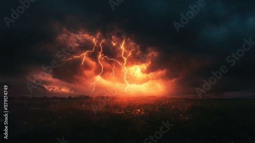 dramatic lightning strike over open field, glowing sky, vibrant atmospheric tones, dynamic perspective, detailed textures, natural phenomenon, isolated background