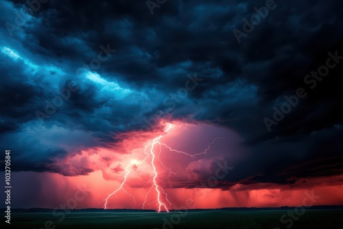 Dramatic lightning strikes against a stormy sky, showcasing nature's power and intensity in a vibrant display.
