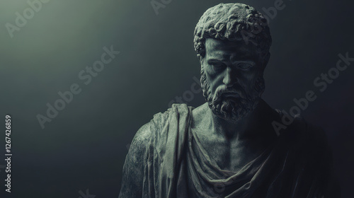 dramatic, moody image of an ancient marble statue of a bearded philosopher or warrior, set against a dark background. The soft lighting enhances the statue's textures and historical feel