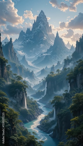 Dramatic Mountain Landscape with Crystal Clear River and Cascading Waterfalls