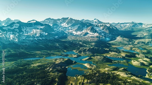 Dramatic mountain range with snow green valleys and pristine glacial lakes