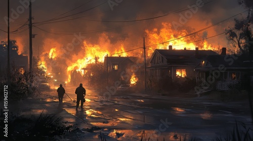Dramatic Nighttime Fire Scene with Two Silhouetted Figures