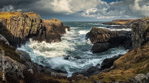 Dramatic ocean waves crashing against rugged coastal rocks under a cloudy sky.