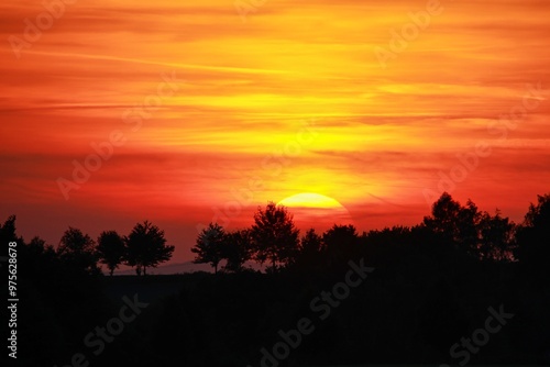 Dramatic Orange Sunset Over Silhouette Trees and Cloudy Sky