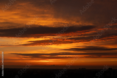 Dramatic panorama of colourful cloud formations in a vast sky - orange sunset
