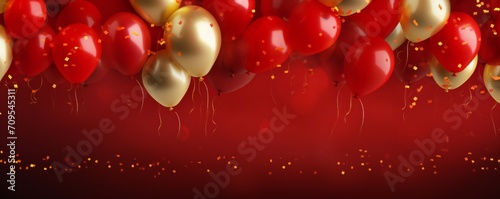 Dramatic party banner background with red and gold balloons and confetti, with empty copy space Generative AI