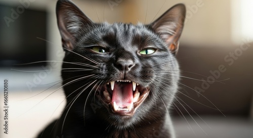 Dramatic Portrait of a Black Cat with Intense Expression and Showing Teeth