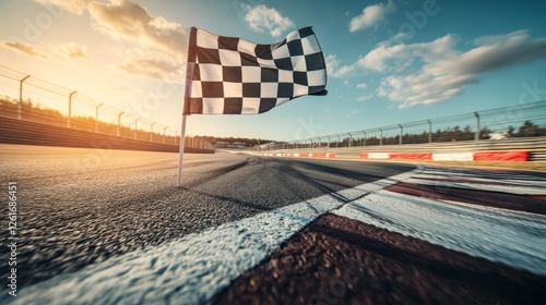 Dramatic racing circuit with a waving checkered flag; the iconic symbol of victory at the culmination of a high-speed automotive competition, set against the backdrop of the sun-dappled racetrack